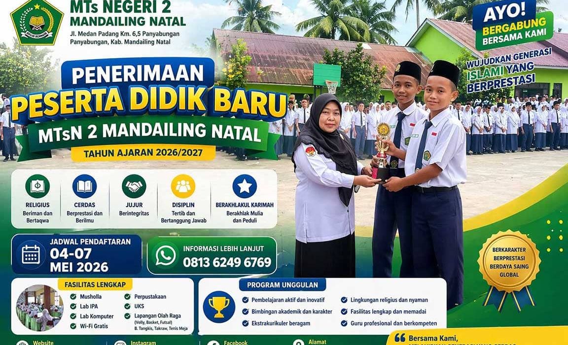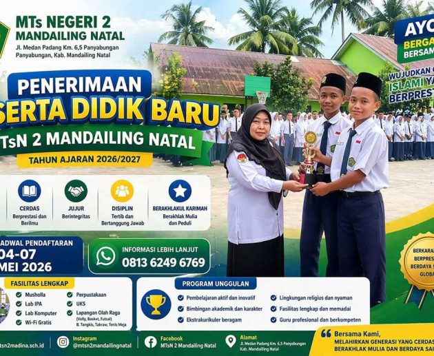 Panyabungan – Kabar baik bagi siswa-siswi lulusan SD/MI yang ingin melanjutkan pendidikan ke jenjang madrasah. MTs Negeri 2 Mandailing Natal